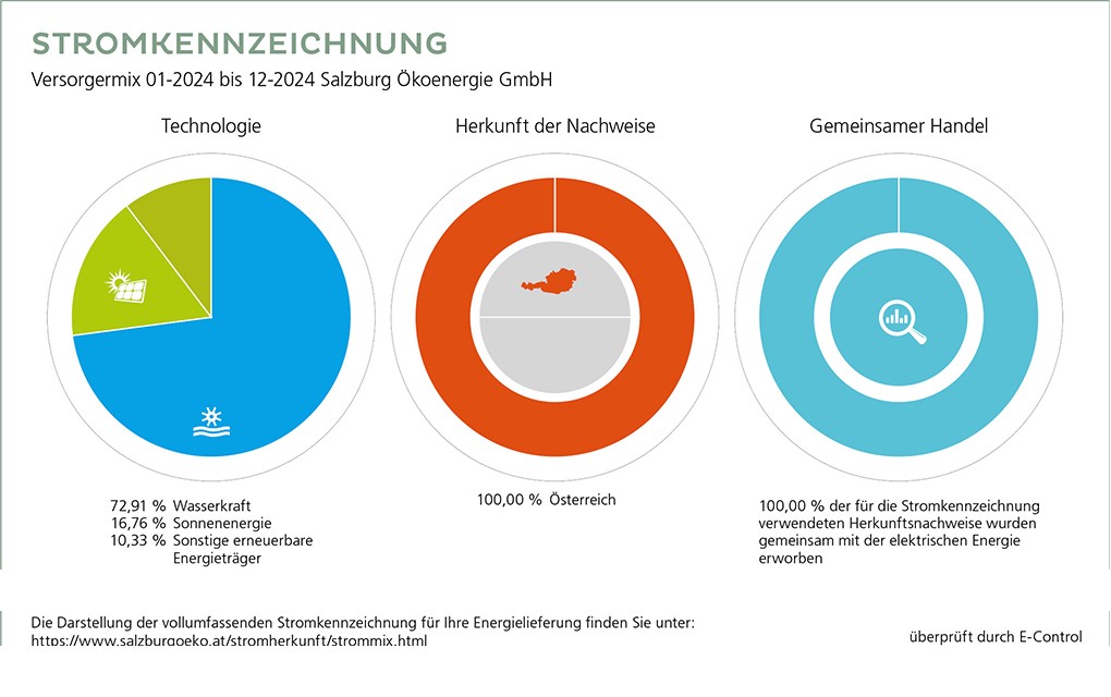 Wir bieten Privatkunden und Unternehmen 100 % ökologischen Strom aus der Region. Der überwiegende Anteil stammt aus Salzburger Kleinwasserkraftwerken. Den Rest decken wir durch gesetzlich zugewiesenen Ökostrom. Die Produkte mit Umweltzeichen weisen einen erhöhten Anteil an Strom aus Salzburger Photovoltaikanlagen auf.